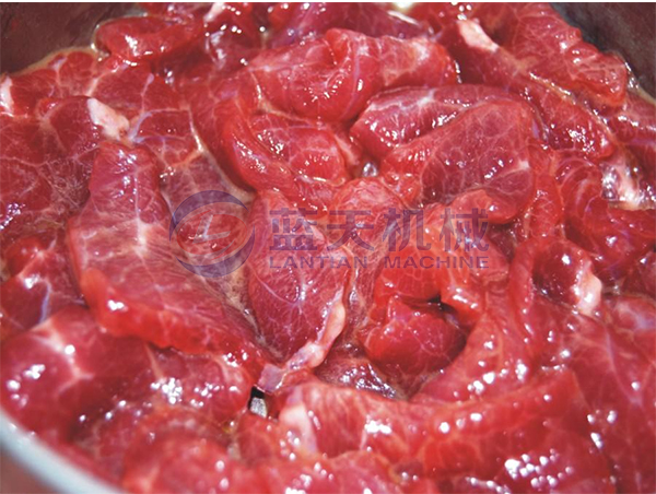 根據(jù)口味需求,加入各種調(diào)料腌制,如鹽、醬油、 白糖、 五香粉、 辣椒粉等等,腌制調(diào)料要攪拌均勻,保證入味,加工廠一般選用牛肉腌漬滾揉機(jī)。腌制的溫度保持在0℃~4℃。(根據(jù)口味的不同,可以搭配不同的調(diào)料,以調(diào)成五香、咸干、原味等等)